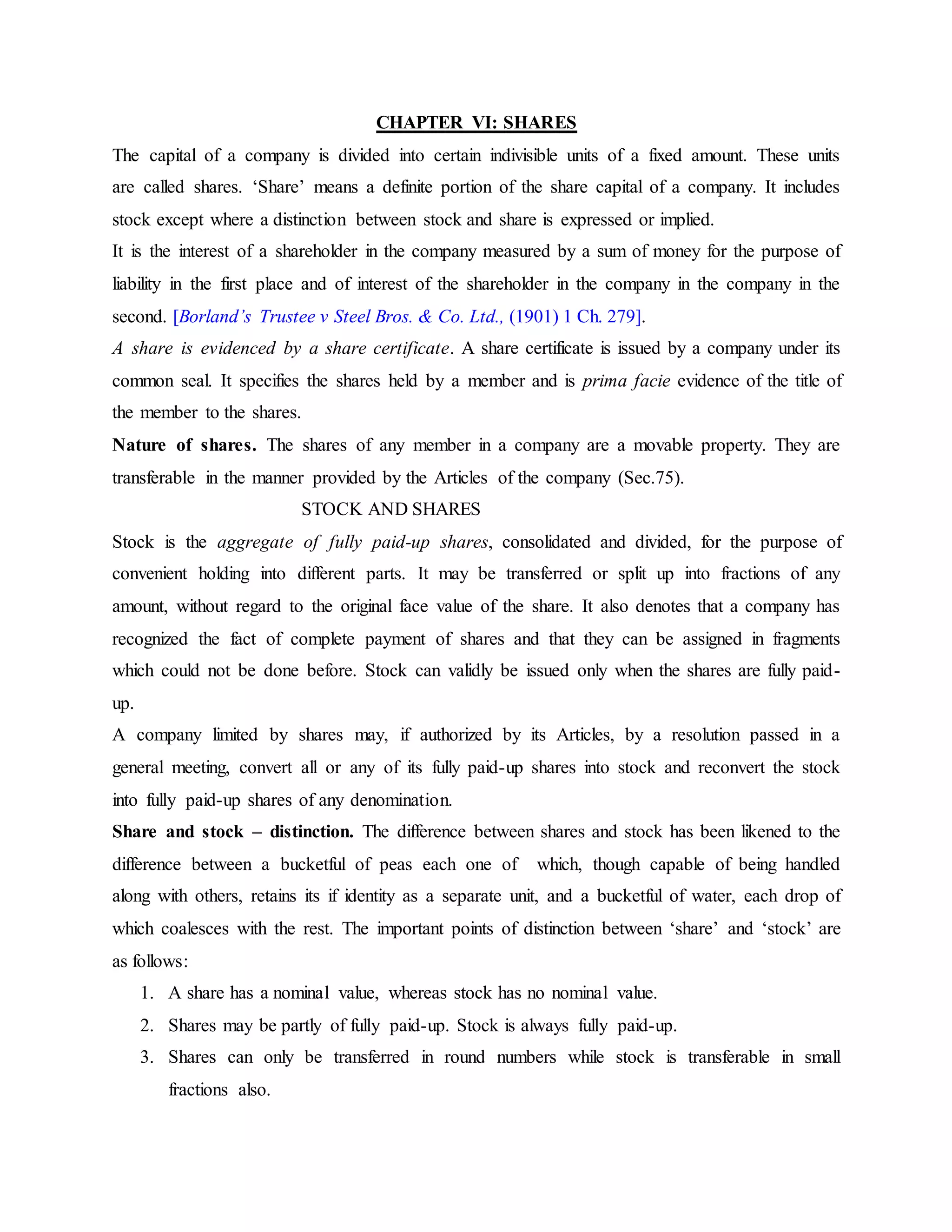 The document outlines the nature and types of shares in a company, highlighting the distinctions between shares and stock, with details on their characteristics and classifications such as preference shares and ordinary shares. It explains the application and allotment process of shares, along with rules regarding minimum subscriptions, allotment effects, and transfer procedures, including the role of share certificates and warrants. Legal implications and the rights of shareholders and companies concerning shares are also discussed, emphasizing the importance of proper registration and transfer protocols.