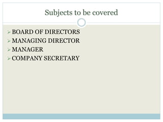 It begins by defining a board of director and outlining qualifications, disqualifications, appointment processes, rights, duties, powers, meetings, and removal of directors. It then discusses the roles of managing directors and whole-time directors, including their appointment, remuneration, and vacation from office. Finally, it provides a brief overview of the responsibilities of company secretaries.