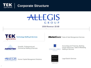 TEKsystems is the largest technology staffing and services company in North America, with $2.3 billion in annual revenue. It has over 26 years of experience in the industry and serves over 82% of Fortune 500 companies. TEKsystems provides a wide range of IT staffing, consulting, and outsourcing services through over 90 offices across the US, Canada, and globally. It has over 70,000 annual placements and maintains high customer, employee, and consultant satisfaction ratings.