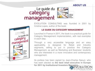 Evolution Consulting was founded in 2001 by Cristina Lopes, author of a book on category management implementation. The company provides consulting services with a focus on retail and consumer goods. It helps clients with strategic planning, category management, layout solutions, and operations to achieve sustainable growth. The company is led by retail professionals with over a decade of experience across food, general merchandise, pharmaceuticals, and textiles.
