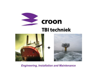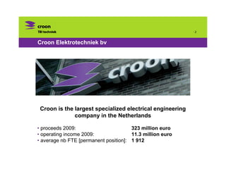 Croon is a large Dutch electrical engineering company specializing in building technologies, industry, infrastructure, and marine and offshore markets. It employs over 1,900 people and had operating income of 11.3 million euros in 2009. Croon provides engineering, installation, and maintenance services and has experience in projects such as ship electrical systems, offshore platforms, compressor containers, and cable installations. It aims to serve as a proactive partner through system integration, tailor-made solutions, and collaboration with customers.