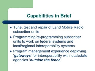 Radionet Communications provides capabilities in land mobile radio systems including tuning, testing, and repairing subscriber units; programming units to work on federal and interoperability systems; and managing interoperability gateway deployments. They have experience programming units for conventional and trunked systems and deploying a regional interoperability system for the Navy Region Northeast. Radionet can also provide consulting services, perform radio frequency coverage simulations using open-source software, conduct system drive testing, and develop communications procedures and protocols.