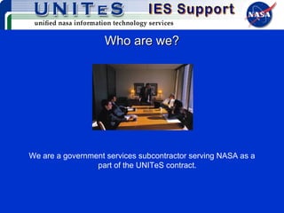 Integrated Engineering Services (IES) is a government services subcontractor for NASA, offering mechanical, architecture, engineering, and infrastructure support through specialized teams. The mechanical team provides CAD/CAM/CAE support, software customization, and technical expertise, while the architecture engineering and construction team focuses on electronic design and environmental GIS applications. The infrastructure team ensures optimal performance of computer systems and servers, alongside technical assistance for user workstations.