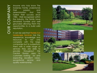 Florida Cut Landscape Services has provided lawn and landscape maintenance in Central Florida since 1982. They offer a wide range of services including mowing, pruning, fertilizing, pest control, irrigation system installation and maintenance. As a family-owned business, they prioritize exceptional customer service and high-quality workmanship.