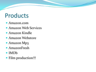 Amazon was founded in 1994 by Jeff Bezos and began as an online bookstore, now having expanded into products such as the Kindle, Amazon Web Services, and Amazon Fresh. It has become the world's largest online retailer and in 2001 was the first to become profitable. Amazon continues to grow and introduce new products and services while maintaining a focus on customer obsession.