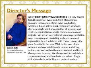 Event Crest (SMC-Private) Limited is an event management and talent representation company based in Lahore, Pakistan that was founded in 2008. The company offers total event production, brand activation, and conference solutions. It represents numerous Pakistani artists and has organized events for major companies. The document provides details on Event Crest's services, clientele, and artist roster.