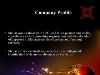 Stellar Management Consultants is a leading Indian consultancy established in 1993 specializing in management systems. It helps organizations achieve certifications in standards including ISO 9001, ISO 14001, ISO/TS 16949, and more. Stellar's team of consultants, trainers and auditors provide consultancy, training, auditing and strategic advice. Its Managing Director has over 40 years of experience in quality, safety, and environmental management systems.