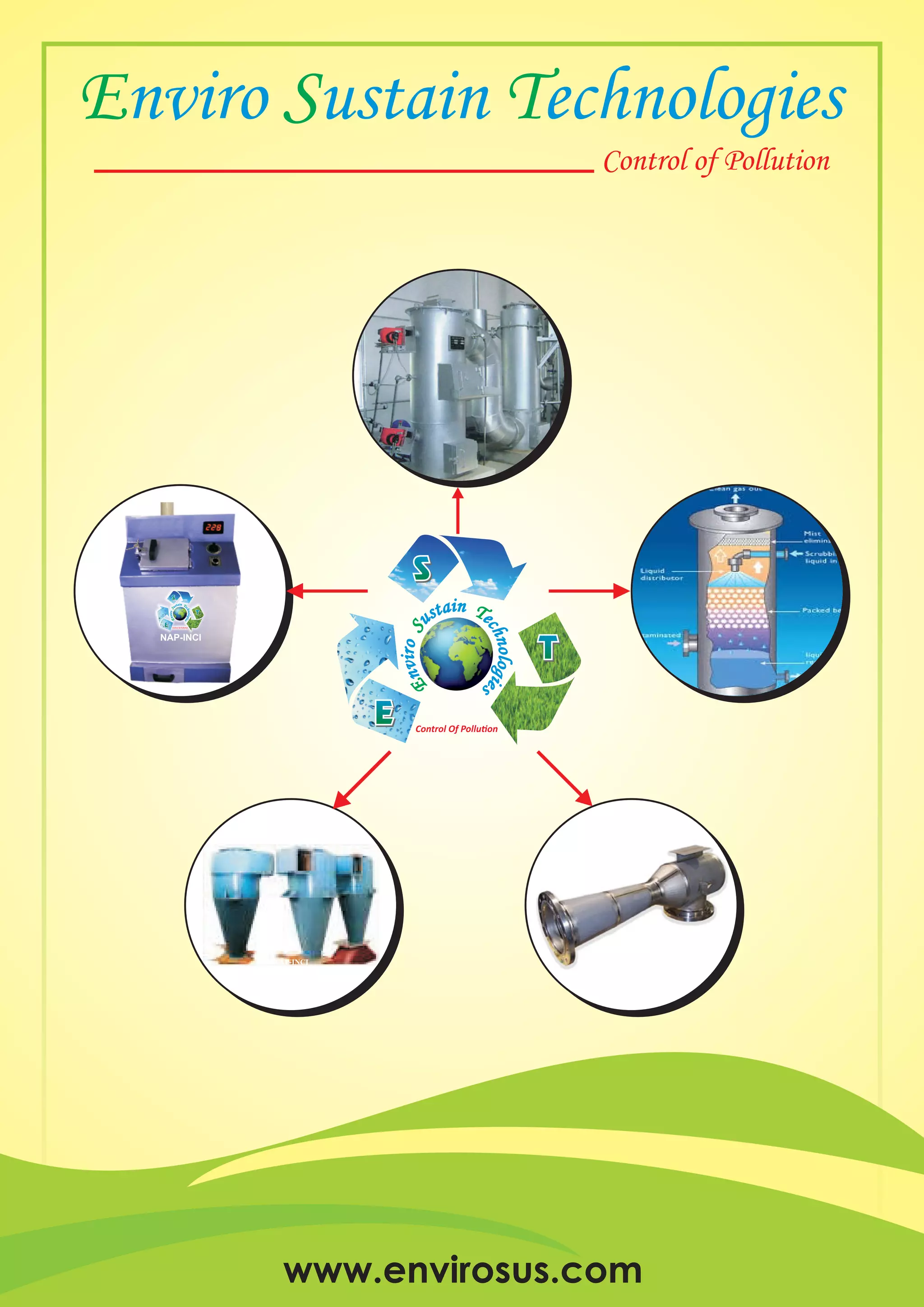 E S Tnviro ustain echnologies is an environmental consulting firm established to provide sustainable development services and personal excellence. The firm works with a network of specialists to bring innovation to customer projects. It has experience managing projects from start to finish according to schedules. The company offers professional environmental services, turnkey project management, solutions tailored to budgets, and relationships with authorities and industry partners to efficiently handle processes. It specializes in combustion solutions, waste management, and air pollution control equipment like scrubbers and separators.