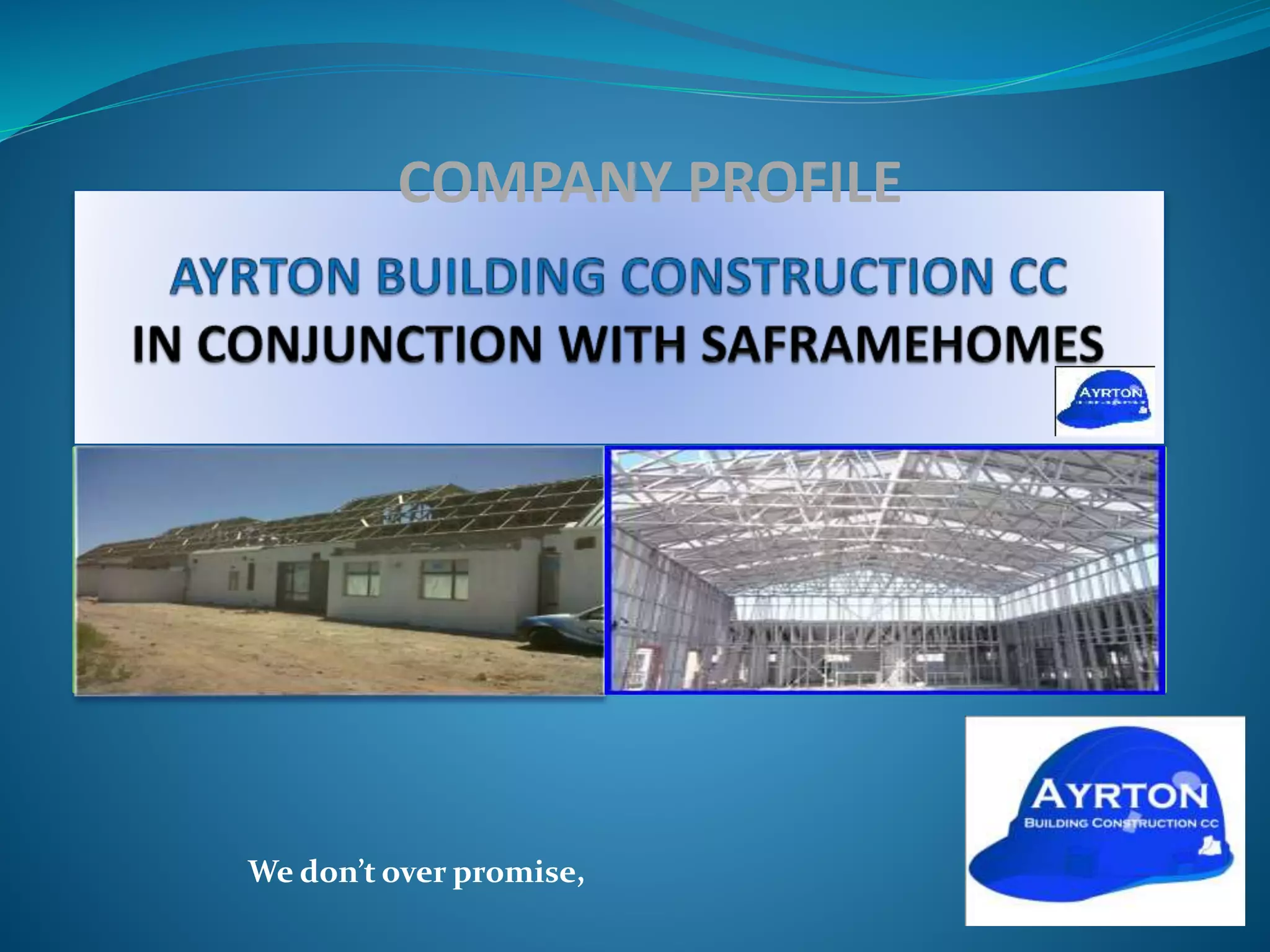 Ayrton Construction CC, established in 2008 and 100% black owned, specializes in general building construction and maintenance services for various clients. With over 40 years of experience, the company has managed projects like clinics and schools, and values teamwork, continuous training, and adherence to green building practices. Their commitment is to provide quality services at competitive rates without shortcuts.