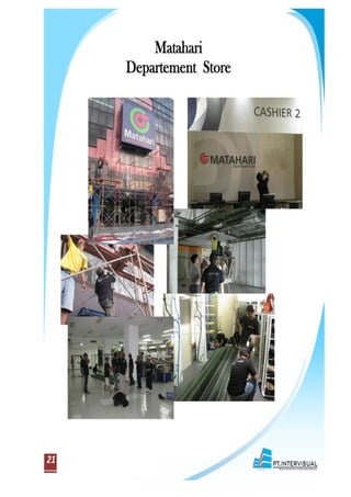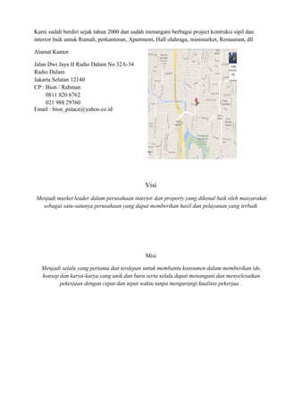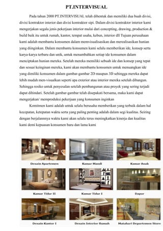 PT. INTERVISUAL didirikan pada tahun 2000 dan memiliki dua divisi yaitu kontraktor interior dan sipil. Perusahaan ini membantu konsumen merealisasikan ide dan konsep hunian mereka dengan memberikan layanan desain 2D/3D, produksi, dan pembangunan interior/eksterior dengan komitmen kecepatan, ketepatan waktu, dan kualitas.