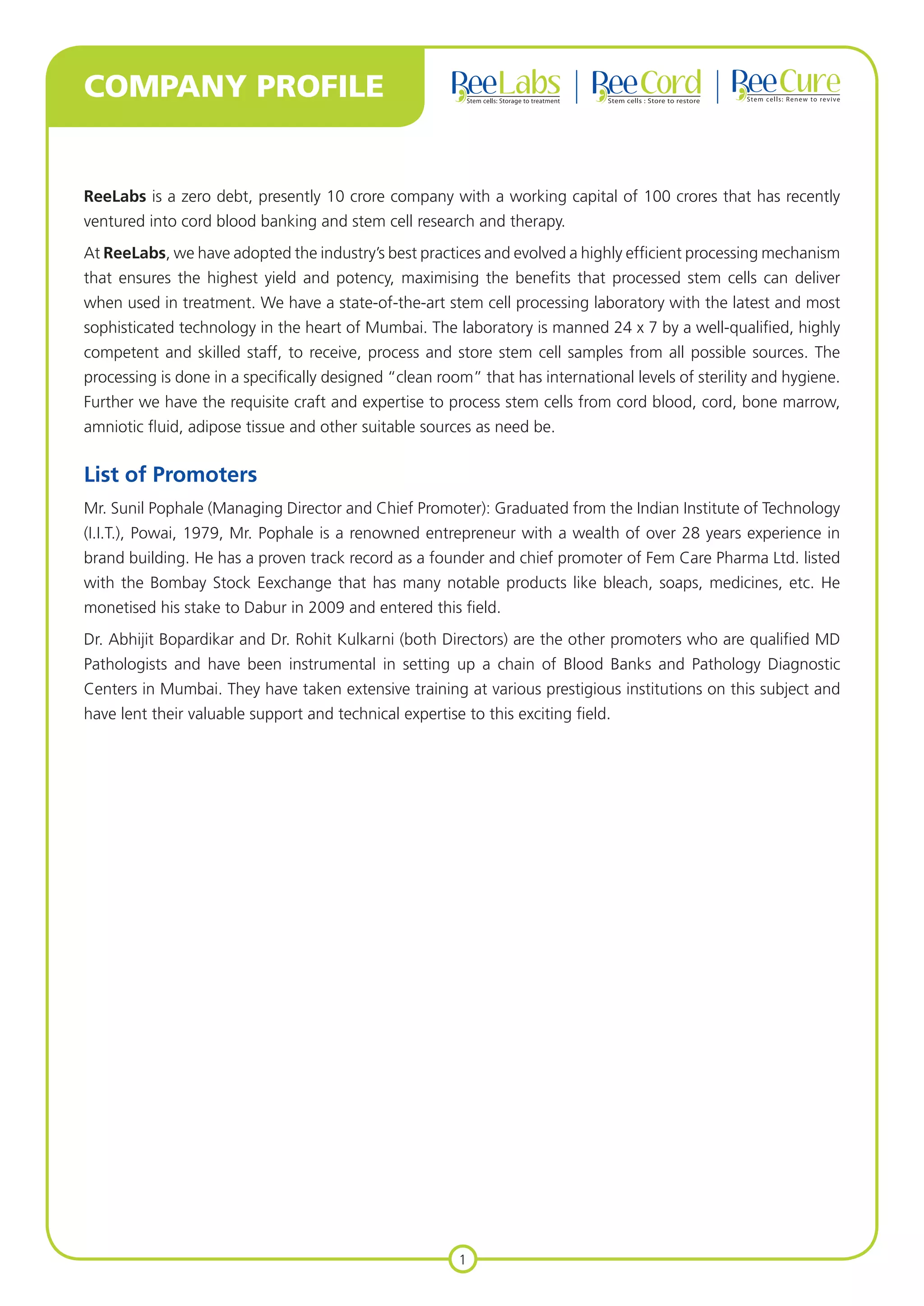 Reelabs is a zero debt, 10 crore company specializing in cord blood banking and stem cell therapy, equipped with a state-of-the-art facility in Mumbai that adheres to international standards. Led by experienced promoters, it offers both stem cell processing and therapeutic solutions to various health conditions, emphasizing high-quality standards and impressive recovery rates. The company aims to transform the healthcare landscape, providing hope for previously untreatable disorders through innovative stem cell treatments.