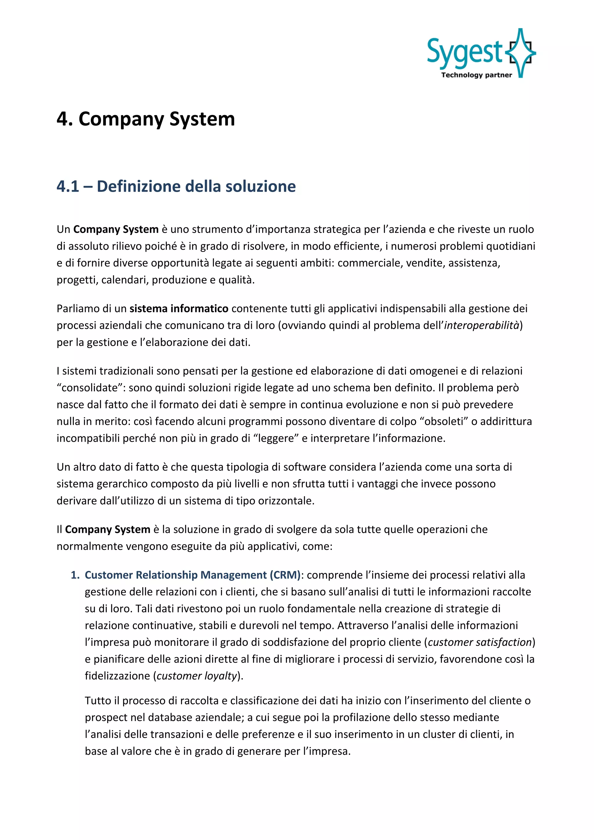 Il company system è uno strumento strategico che integra diversi strumenti informatici per gestire e ottimizzare processi aziendali in ambiti quali vendite, assistenza, e produzione. Questo sistema consente di monitorare l'avanzamento delle commesse, analizzare le performance e migliorare la comunicazione interna ed esterna, superando le limitazioni dei sistemi tradizionali. Infine, si adatta dinamicamente ai cambiamenti e fornisce una piattaforma per un'ampia gestione documentale e operativa, essenziale per l'era dell'industria 4.0.