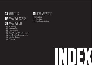Xelement is a creative agency that offers marketing and advertising solutions to help businesses establish, revive or grow. It provides services such as branding, advertising, consultancy, web design, app design, interior design, and printing. The agency aims to help individuals and organizations achieve their goals and potential by providing them with a distinguishing "Xelement". It works through three phases - exploring clients and target audiences, designing visual and holistic branding solutions, and implementing plans through overseeing production to match the vision with reality.