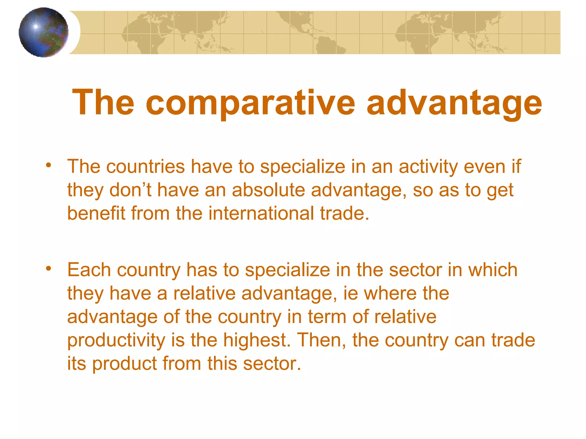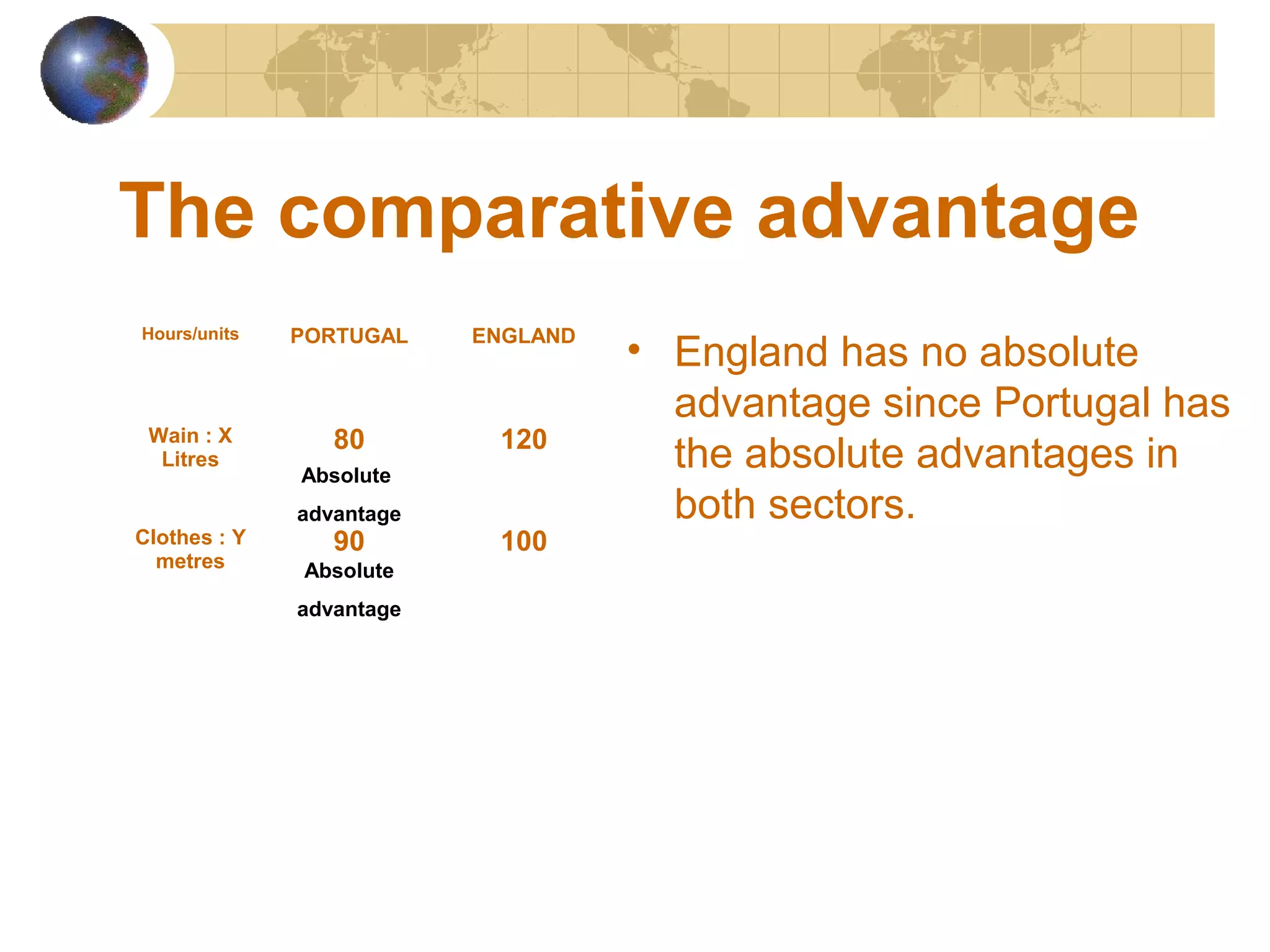 The document discusses comparative advantage and how countries can benefit from international trade. It explains that countries should specialize in producing goods where they have a comparative rather than absolute advantage. This is determined by comparing productivity ratios across sectors. The example shows Portugal has a comparative advantage in wine and England in clothes. Specializing allows each country to produce more of its strong good and trade, benefiting both countries through increased production possibilities and saving labor.