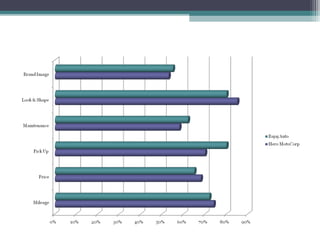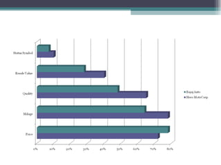 The document provides a comparative analysis of Bajaj Auto and Hero MotoCorp, two major Indian motorcycle manufacturers. It discusses the history and operations of both companies. Bajaj Auto was founded in 1945 and is a global leader in motorcycles and three-wheelers. Hero MotoCorp was formed in 1984 as a joint venture between Hero Group and Honda that became the largest motorcycle manufacturer globally by 2001. The document also outlines research methodology used including primary and secondary data collection through surveys. Key findings indicate that Hero MotoCorp's Splendor and Passion models and Bajaj's Discover and Pulsar are most popular. Price, mileage, and quality are main factors influencing purchase decisions.