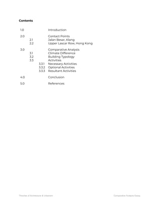 This document appears to be a student's comparative analysis essay on the public spaces of Jalan Besar in Klang, Malaysia and Upper Lascar Row in Hong Kong. It begins with an introduction providing context on the locations and Jan Gehl's theories. It then examines 5 contact points for each area, analyzing activity intensity and interaction types. A comparative analysis follows on climate differences, building typologies, and types of activities in the spaces. Activities are categorized as necessary, optional or resultant based on environmental factors.