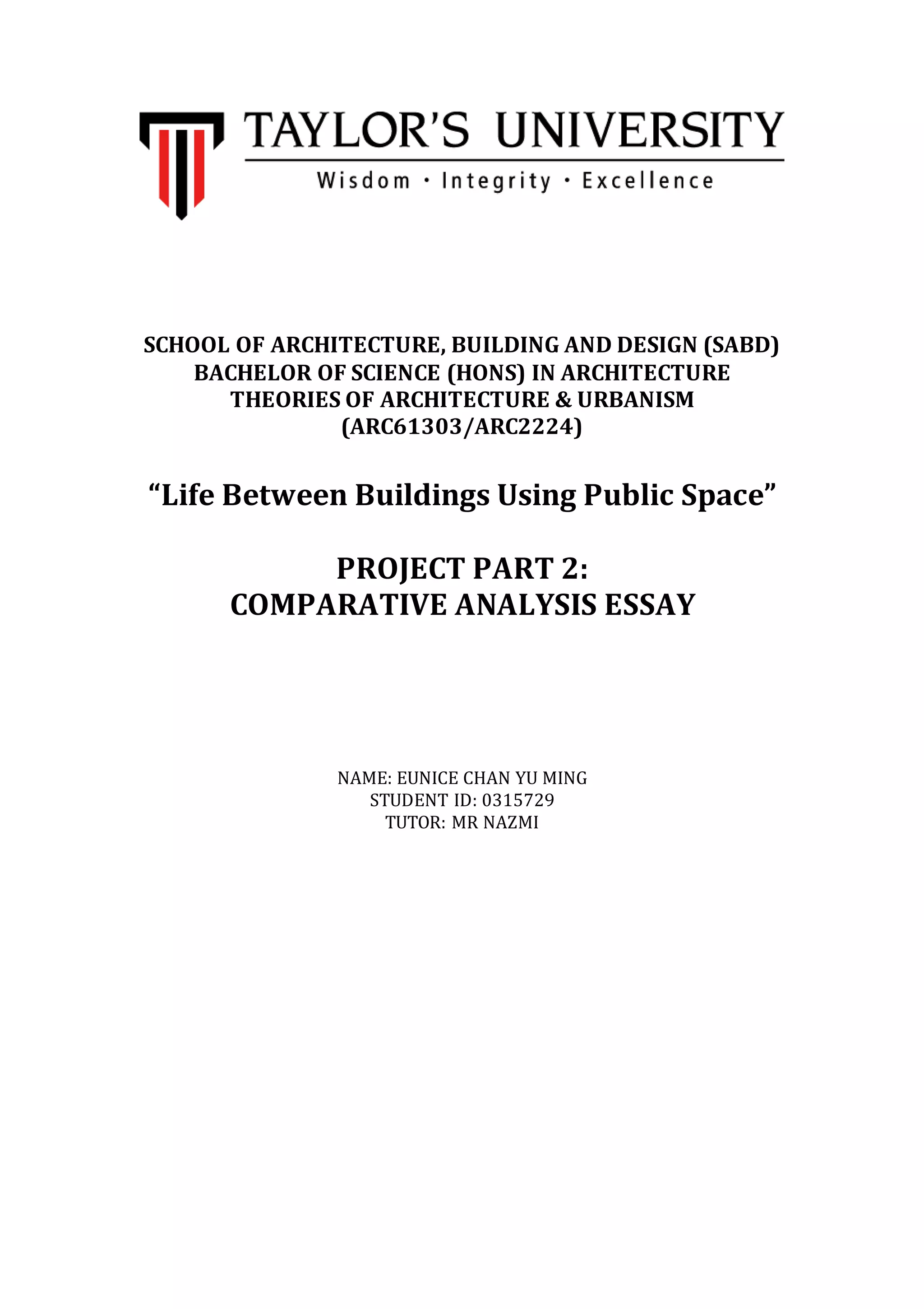 This document provides a comparative analysis of Petaling Street in Kuala Lumpur, Malaysia and Newbury Street in Boston, USA based on Jan Gehl's theories of public space from his book "Life Between Buildings". Both streets are shopping destinations but offer different social experiences. Petaling Street features food stalls and merchandise displays that encourage interaction, while Newbury Street has indoor stores and sidewalk cafes that enable chance encounters. Though similar in diversity of users, the streets differ in occurrence and intensity of contact points like visual connections, conversations, and planned versus spontaneous gatherings.