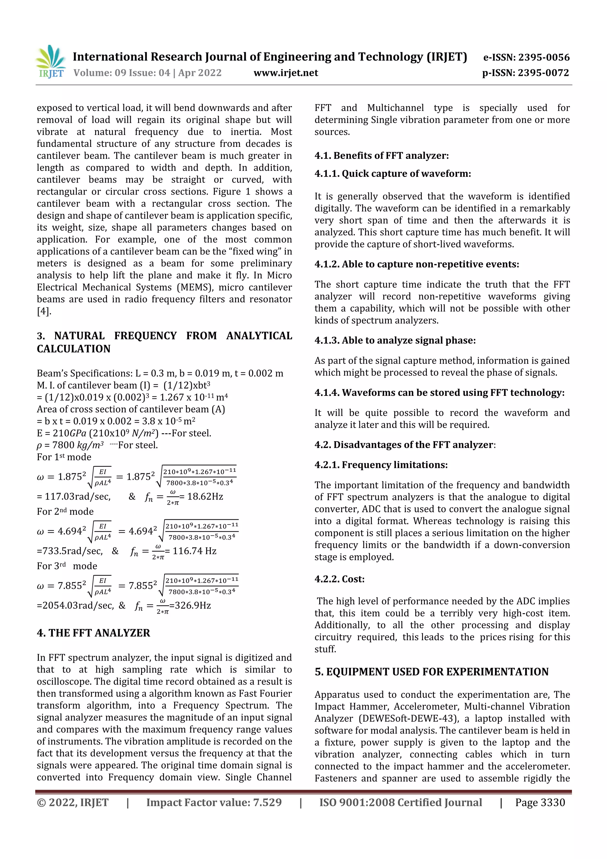 This document presents a comparative analysis of the natural frequency of transverse vibration of a cantilever beam using analytical and experimental methods. Analytical calculations are performed to determine the natural frequencies of the first three modes of vibration of the cantilever beam. Experimental testing is conducted using an impact hammer, accelerometer, and FFT analyzer. The natural frequencies measured experimentally are found to be close to those calculated analytically. The results demonstrate that analytical and experimental methods can both accurately determine the natural frequencies of a cantilever beam's vibration.