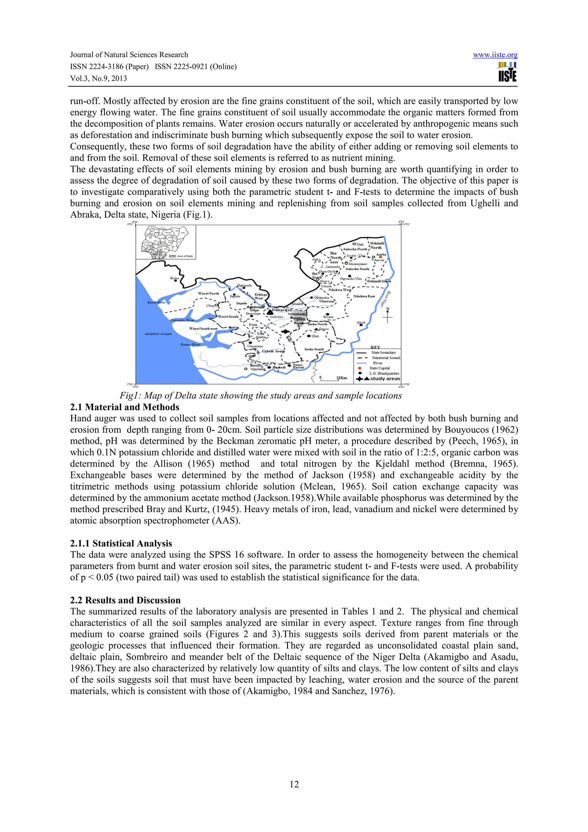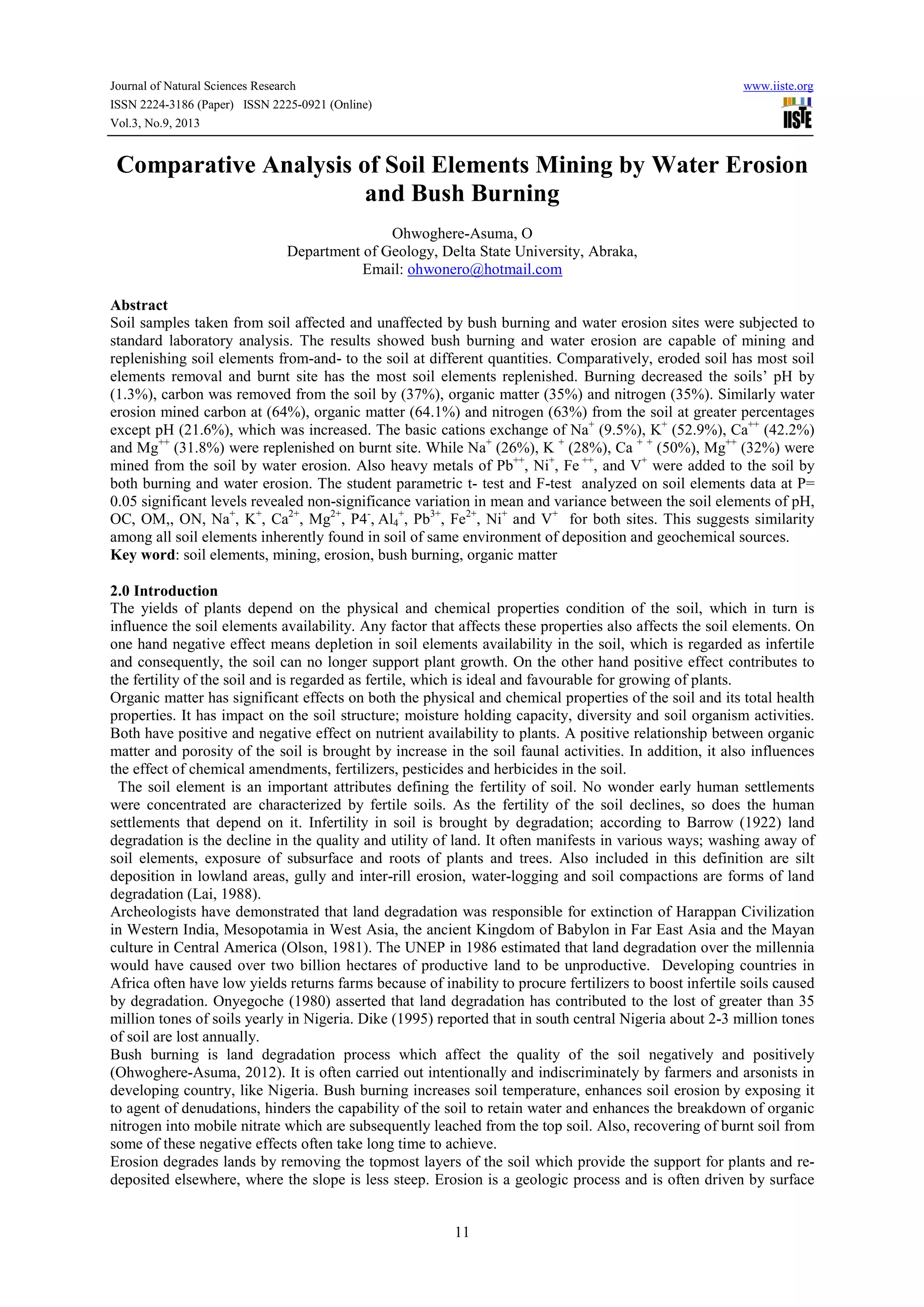 The document summarizes the results of a study comparing the effects of bush burning and water erosion on soil element mining and replenishment. Laboratory analysis of soil samples from sites affected and unaffected by these processes found that: