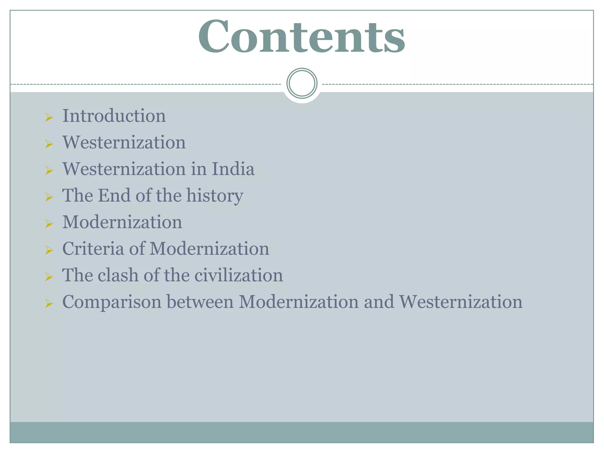 This document compares and contrasts westernization and modernization. It defines westernization as the adoption of western democratic, secular, and free market ideals as well as values like individualism, equality, and constitutionalism. Modernization is defined by criteria like industrialization, urbanization, rational thought, education, communication, and centralized states. The document outlines theories of modernization and westernization in India and concludes that westernization focuses on adopting western behaviors and values in a homogeneous way, while modernization implies positive social and political change leading to heterogeneity.