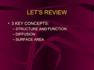 The document reviews key concepts in comparative anatomy including structure and function, diffusion, and surface area. It discusses how these concepts help the villi in the digestive system function, and compares the digestive, respiratory, circulatory, excretory and nervous systems across different animal phyla like mammals, arthropods, annelids, and cnidarians.