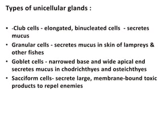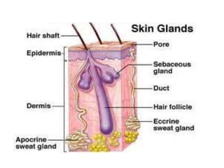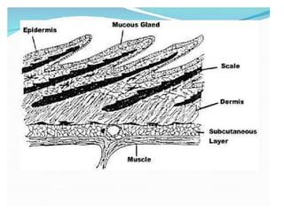 This document provides information on the integumentary system of several chordates including humans, fish, birds, cattle/horses, and ruminants. It describes the basic structure of skin which consists of an epidermis, dermis, and hypodermis layers across these species. Key differences are highlighted such as fish having scales instead of hair and birds having feathers. The structure and function of hair, nails, hooves and horns are also reviewed for different animals.