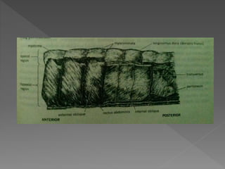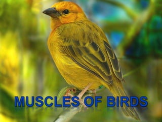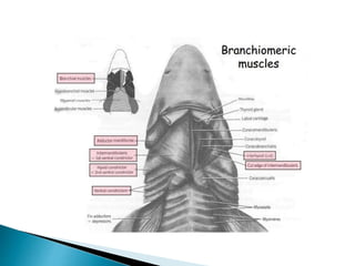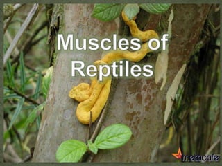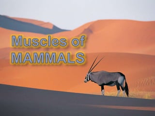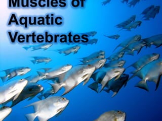 This document provides an outline for a project on the muscular system. It begins with an introduction and then outlines the general structures and functions of muscles. The remainder of the document compares the anatomy of muscles across different vertebrate groups including aquatic vertebrates, amphibians, reptiles, birds, and mammals. For each group, it describes the axial musculature, appendicular musculature, jaw muscles, and how muscles have evolved between groups. Tables are provided comparing muscle features across the five vertebrate classes.
