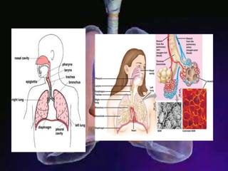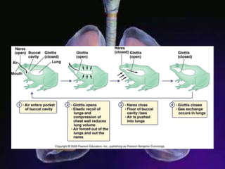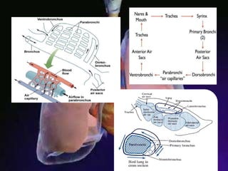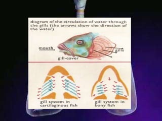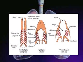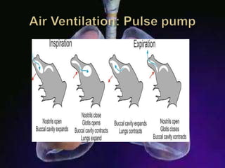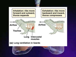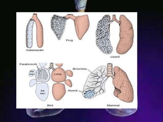 The respiratory system allows organisms to take in oxygen and release carbon dioxide through the process of respiration. Respiration includes ventilation, external respiration where gases are exchanged with the environment, and internal respiration where gases are exchanged at the tissue level. The main respiratory organs are lungs, gills, and in some cases skin or gas bladders. Lungs are found in air-breathing vertebrates like mammals and birds, using an aspiration pump for ventilation. Gills are found in fish and some aquatic amphibians and function via various water pumping mechanisms. Skin respiration also occurs in some amphibians.