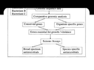 The document discusses genomics and comparative genomics. It defines genomics as the study of genomes and notes that comparative genomics compares two or more genomes to discover similarities and differences. Comparative genomics can provide insights into evolutionary biology, drug discovery, gene function prediction, and identification of genes and regulatory elements. The document outlines different levels of genome comparison including nucleotide statistics, genome structure at the DNA and gene levels, and describes various methods used in comparative genomic analyses.