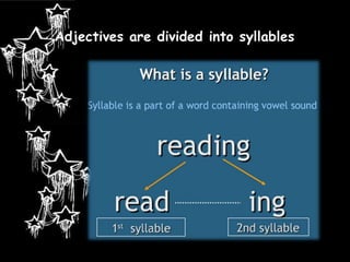 The document discusses how to form the comparative and superlative forms of adjectives in English. It explains that one-syllable adjectives form the comparative by adding -er and the superlative by adding -est. Two-syllable adjectives ending in -y form the comparative and superlative by changing the -y to -ier and -iest. All other adjectives use "more" and "most" before the base adjective to form the comparative and superlative. It provides examples of irregular adjectives like "good" and "bad" that have unique comparative and superlative forms.