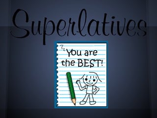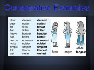The document introduces rules for using comparative and superlative forms of adjectives when comparing two or more things. It provides an example of using "bigger" to compare two monkeys and "biggest" to compare three or more monkeys. Then it lists common adjectives and their comparative and superlative forms in both English and Spanish.