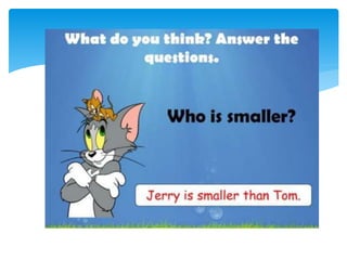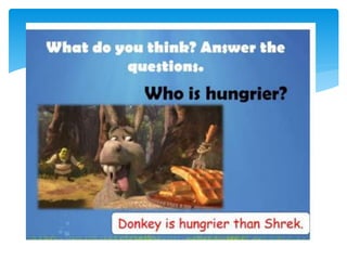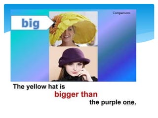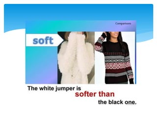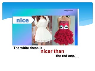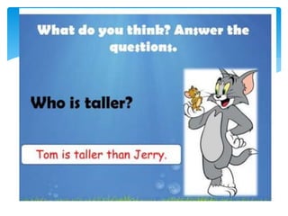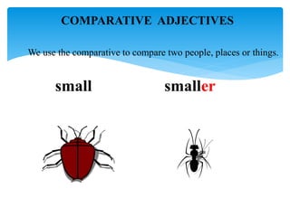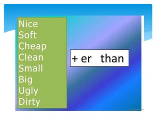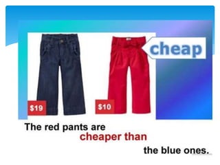This document provides information on comparative and superlative adjectives in English. It explains that comparatives are used to compare two people or things, while superlatives compare more than two. It details the rules for forming comparatives and superlatives, including adding -er, -est, more, most or using irregular forms. Examples are given such as "taller", "the tallest". The document also includes exercises where readers must fill in the comparative or superlative form of adjectives in sentences. Overall, the document serves as a guide for learners on how to properly use comparative and superlative adjectives in English.