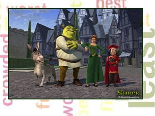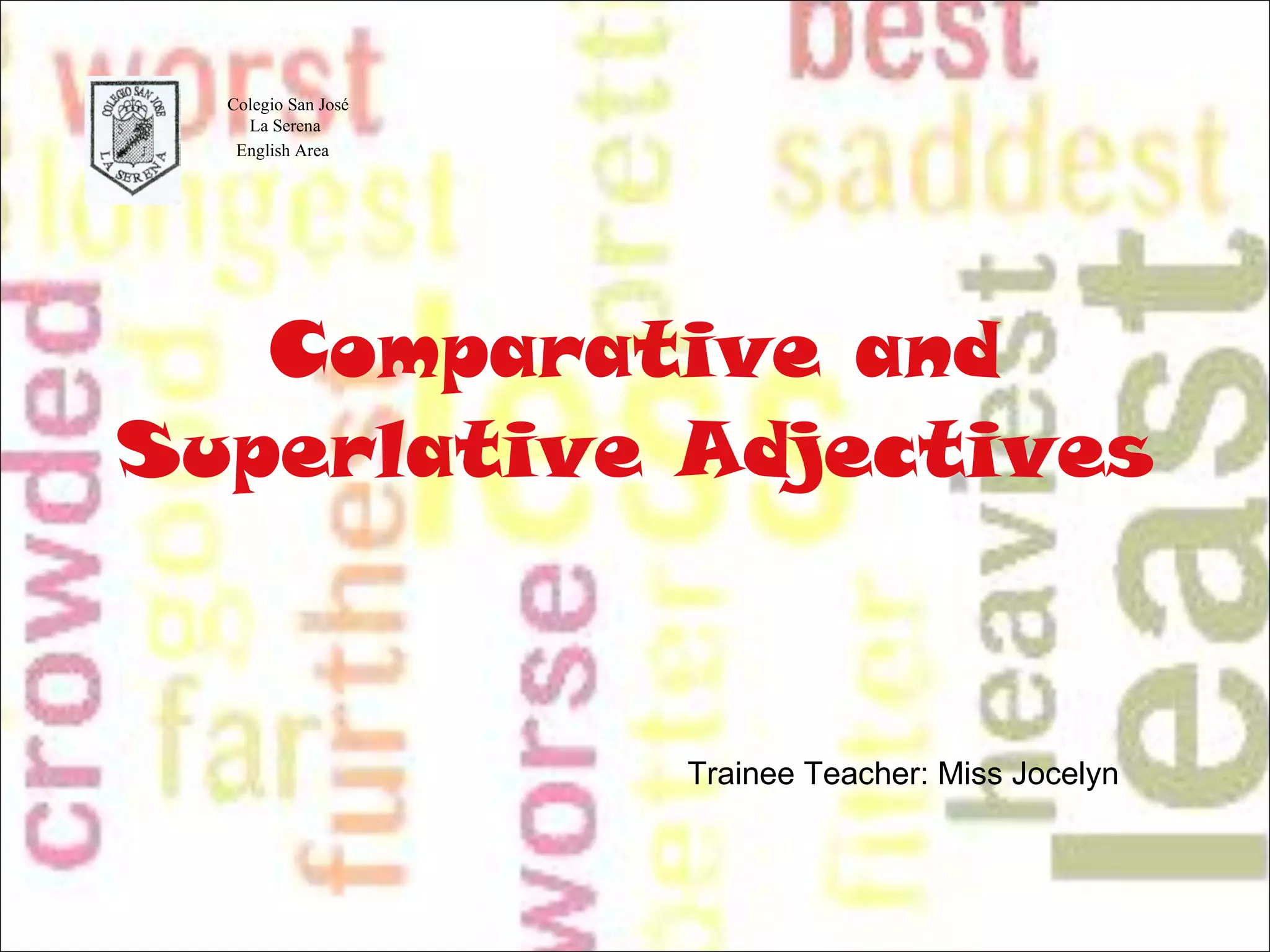 The document discusses comparative and superlative adjectives in English. It provides rules for forming comparatives and superlatives for adjectives of different syllable patterns, including irregular forms. It includes examples and activities with multiple choice and fill-in-the-blank questions about comparatives and superlatives.