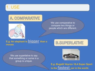 1. Comparative and superlative forms are used to compare two or more things. Comparative compares two items, while superlative compares an item to a whole group.