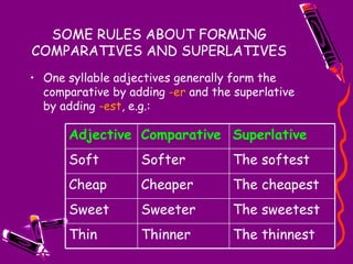This document provides rules and guidelines for forming comparative and superlative adjectives in English. It explains that one-syllable adjectives typically form the comparative with -er and the superlative with -est. There are spelling rules for adjectives ending in certain letters. Two-syllable adjectives ending in -y change the -y to -i. Adjectives ending in -ed, -ing, -ful, or -less use 'more' and 'most'. Three-syllable adjectives also use 'more' and 'most'. Irregular adjectives like 'good' and 'bad' are listed. The uses of comparatives and superlatives are described,