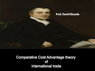 David Ricardo originated the theory of comparative cost advantage in his 1817 book. The theory states that countries will export goods that they have a lower relative production cost in and import goods with higher relative costs, even if one country may have an absolute cost advantage in all goods. The theory assumes two countries and goods, homogeneous and mobile factors of labor, no transportation or trade barriers, and constant returns to scale. England has a lower relative cost (cost advantage) in cloth and Portugal has a lower cost in wine, so each country specializes and gains from trade by exporting their lower cost good and importing the other good. However, the theory makes unrealistic assumptions and does not consider all real-world complexities of international trade.