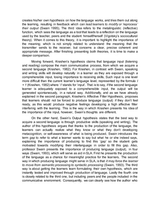 This document compares Stephen Krashen's Input Hypothesis from 1977 and Merrill Swain's Output Hypothesis from 1993 regarding second language acquisition. Krashen's hypothesis consists of five points including the idea that language is acquired through comprehensible input, while affective factors like anxiety can inhibit acquisition. Swain's hypothesis has three points and argues that language production is important for noticing gaps and modifying one's language. While the hypotheses differ on the importance of input versus output, the document concludes that both are needed to some degree and are more applicable to different learning goals like syntax versus vocabulary.