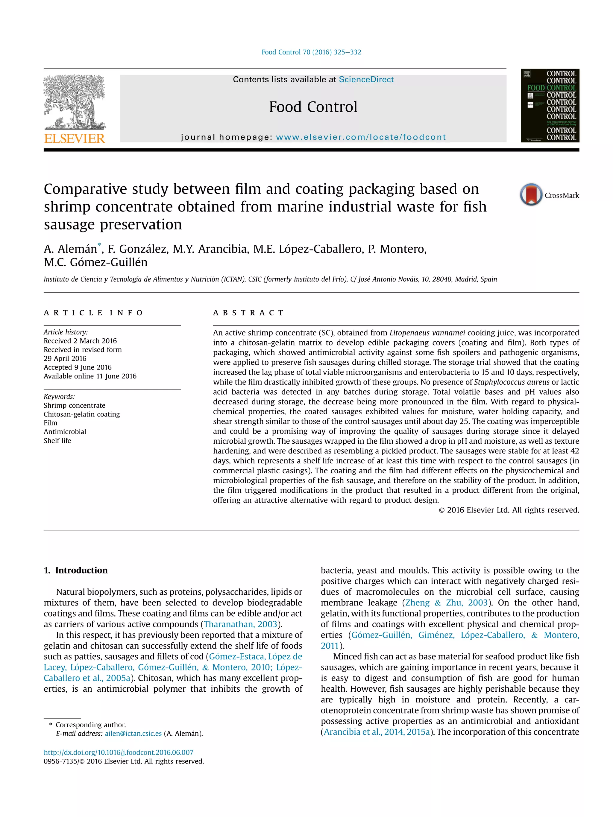 This study compared the effectiveness of a shrimp concentrate film and coating at preserving fish sausages during chilled storage. The coating increased the lag phase of total microorganisms and enterobacteria to 15 and 10 days, respectively, while the film drastically inhibited the growth of these microbes. Both helped maintain quality by decreasing pH and volatile bases during storage, with greater effects seen from the film. The coating kept sausage properties similar to controls for 25 days while the film resulted in a lower moisture and pH product resembling pickled sausage that remained stable for at least 42 days.