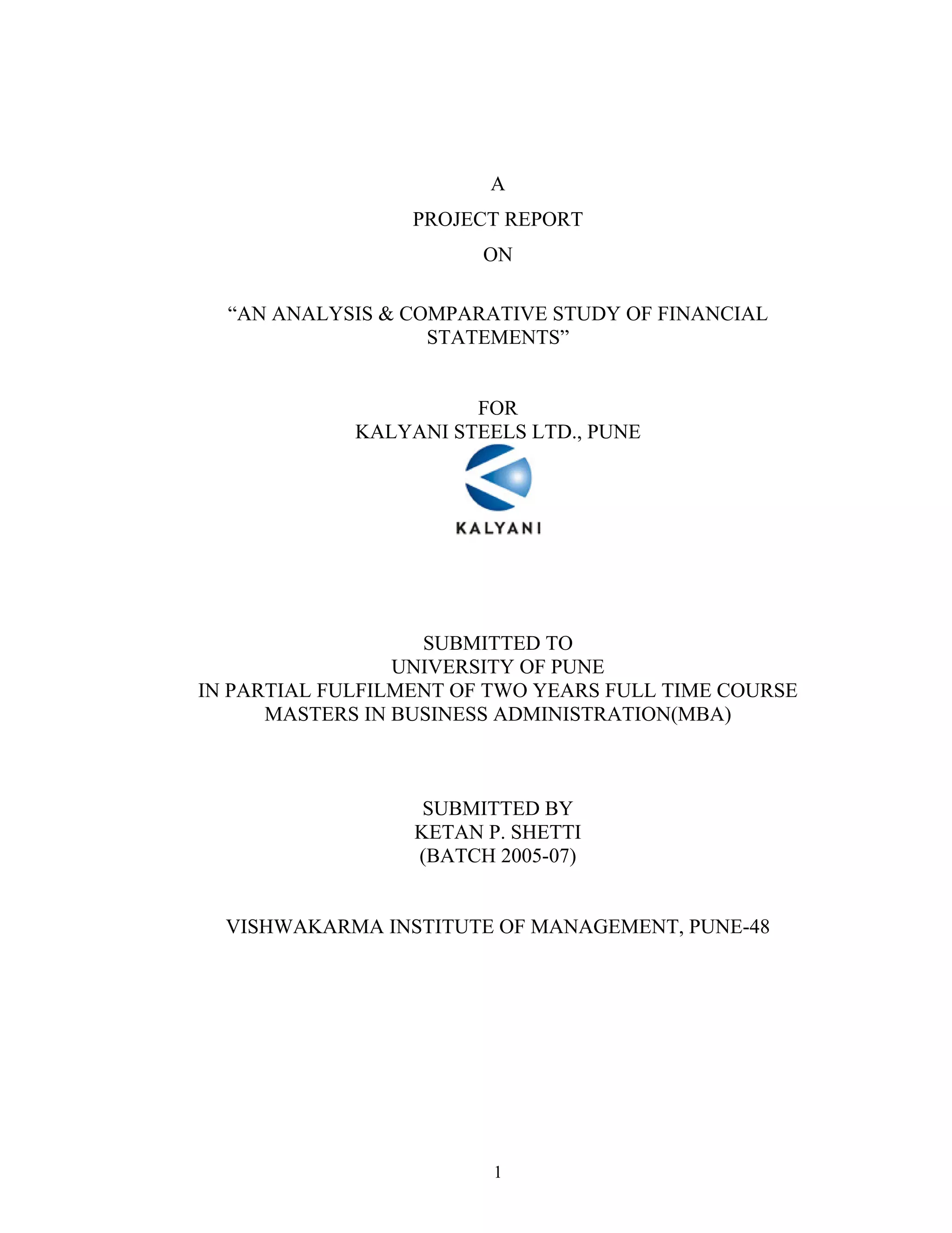 This project report presents an analysis and comparative study of financial statements for Kalyani Steels Ltd. using ratio analysis to assess the company's financial viability in terms of liquidity, solvency, and profitability. The study highlights the importance of the Kalyani Group's manufacturing strengths and strategic initiatives that position it as a leader in carbon and alloy steel production. Ketan P. Shetti, the author, expresses gratitude to several individuals for their support during the project, which is part of his MBA coursework at the University of Pune.