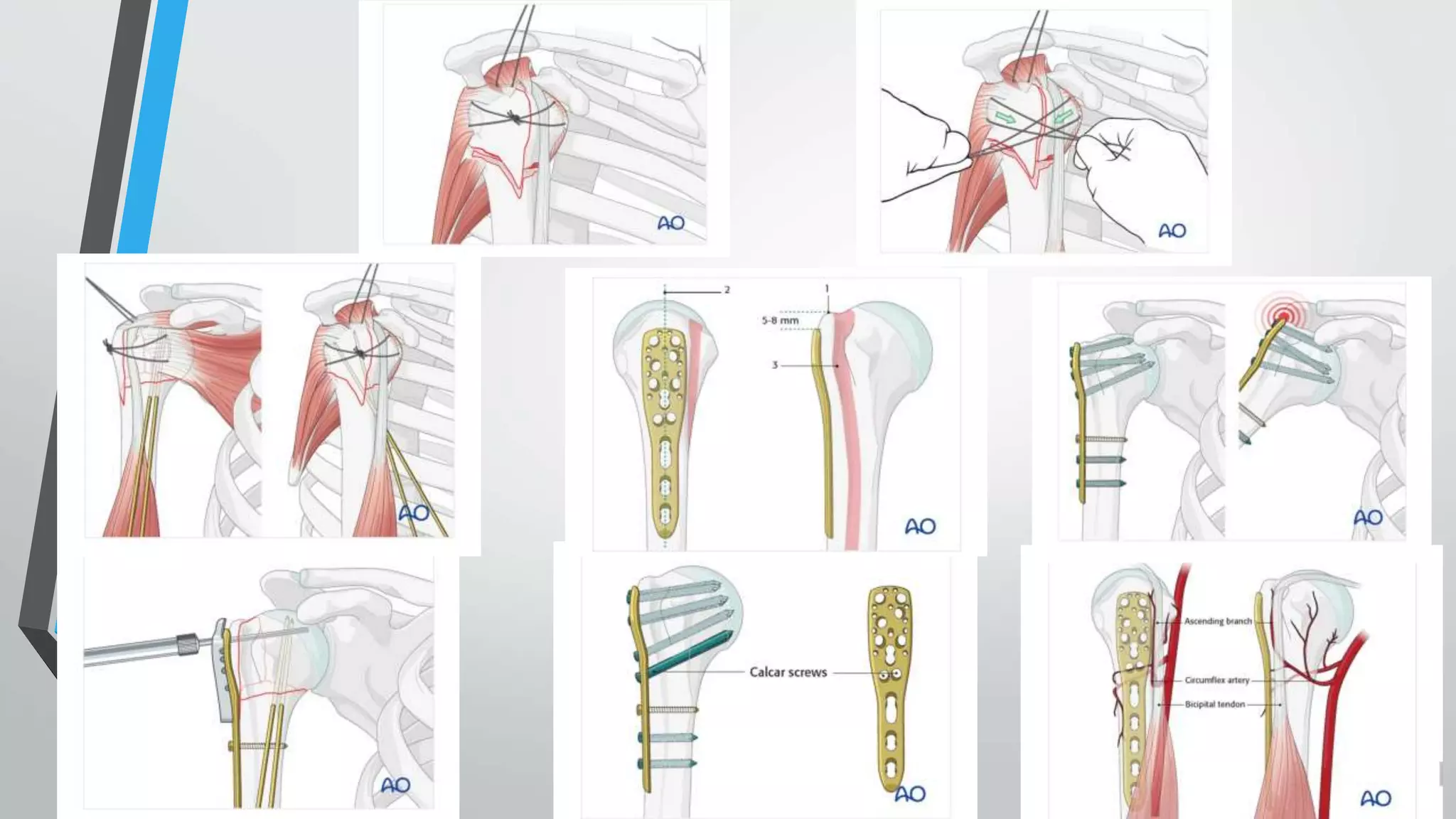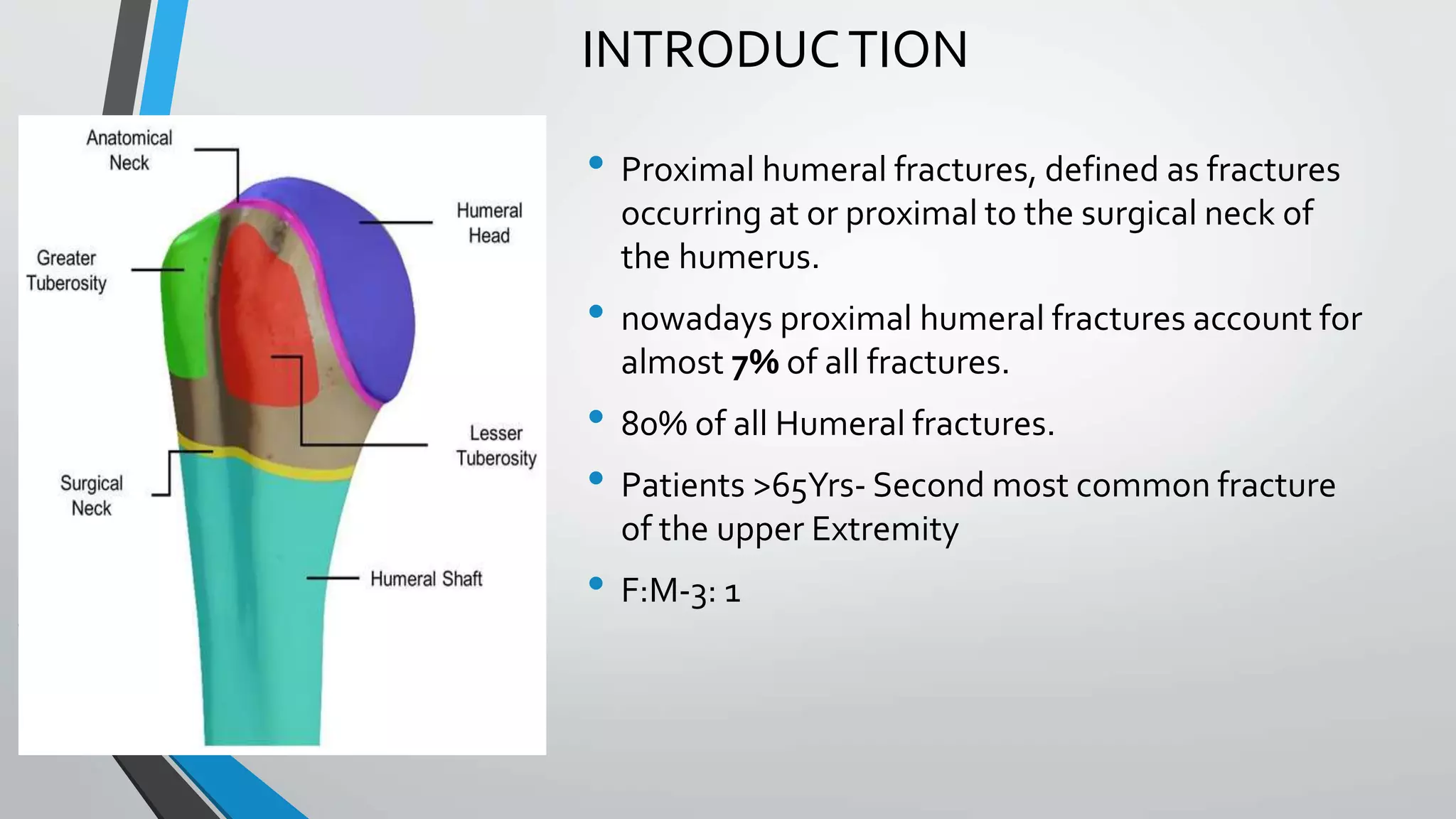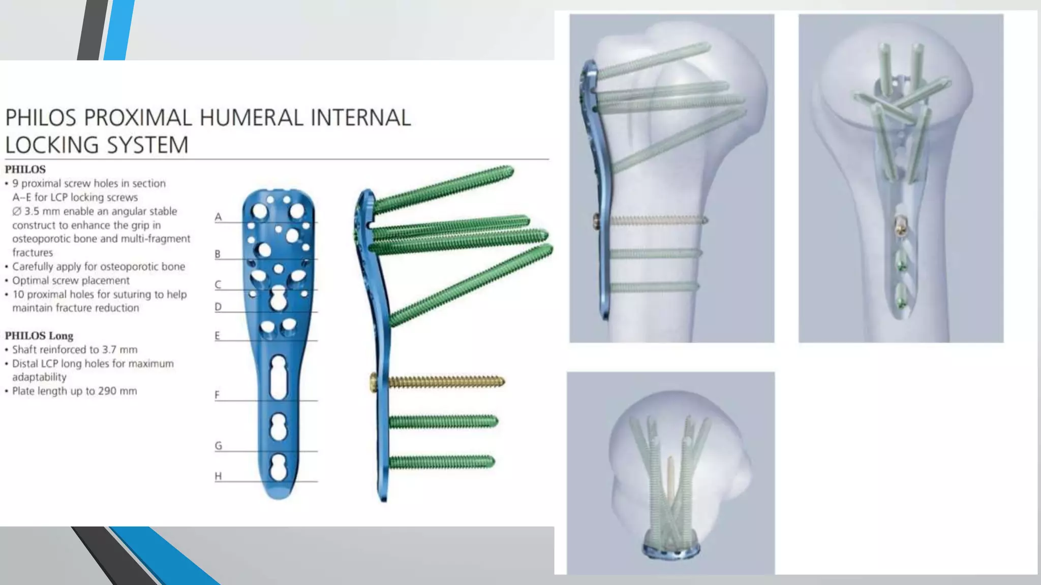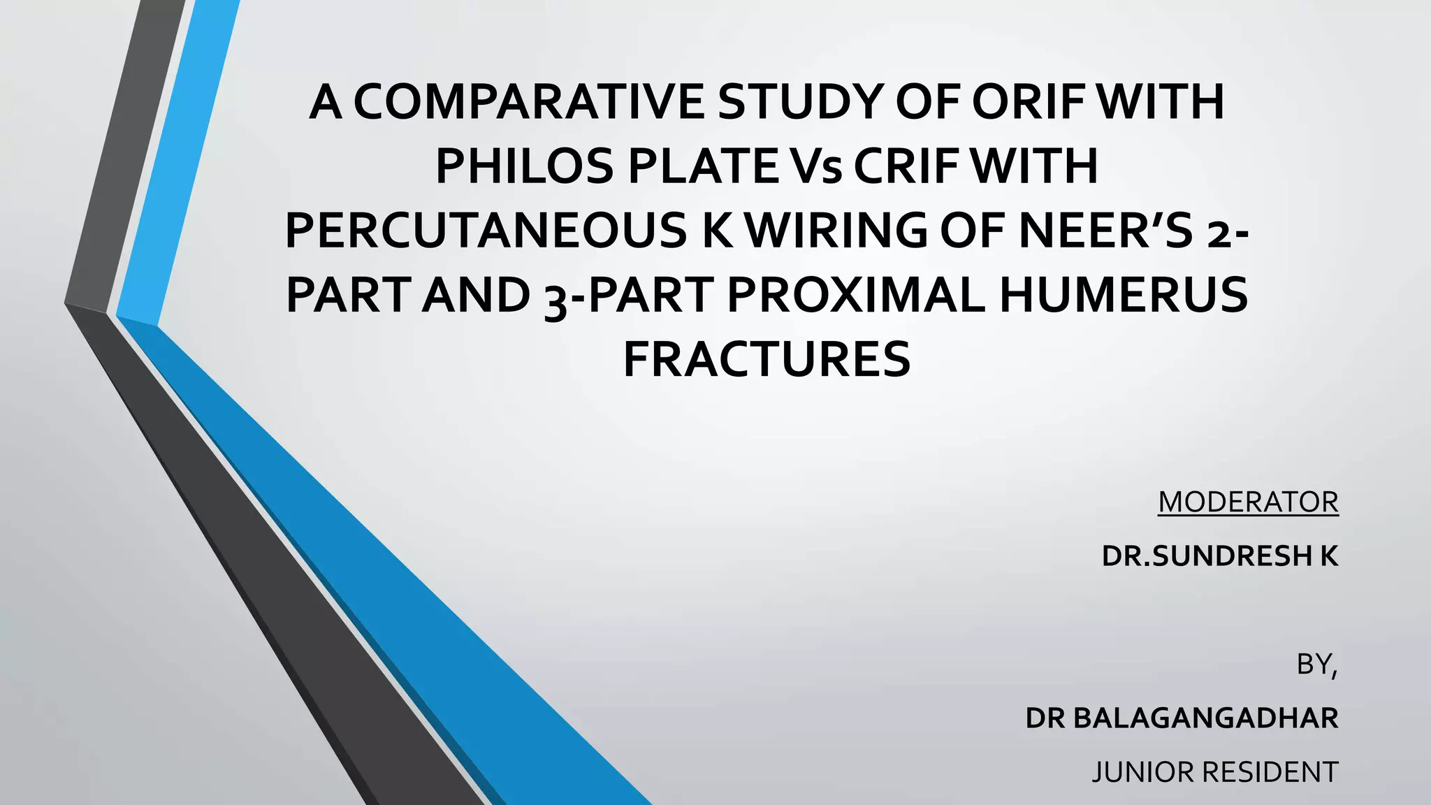 This document presents a comparative study of open reduction with internal fixation (ORIF) using a Philos plate versus closed reduction with percutaneous K-wiring for treating Neer's 2-part and 3-part proximal humerus fractures. The study involved 40 cases and evaluated clinical, functional, and radiological outcomes, ultimately finding no significant difference in scores between the two methods, although Philos plate fixation allowed for better radiological results. The study concludes that both techniques are effective, with K-wire fixation being preferred due to its less invasive nature and reduced surgical trauma.