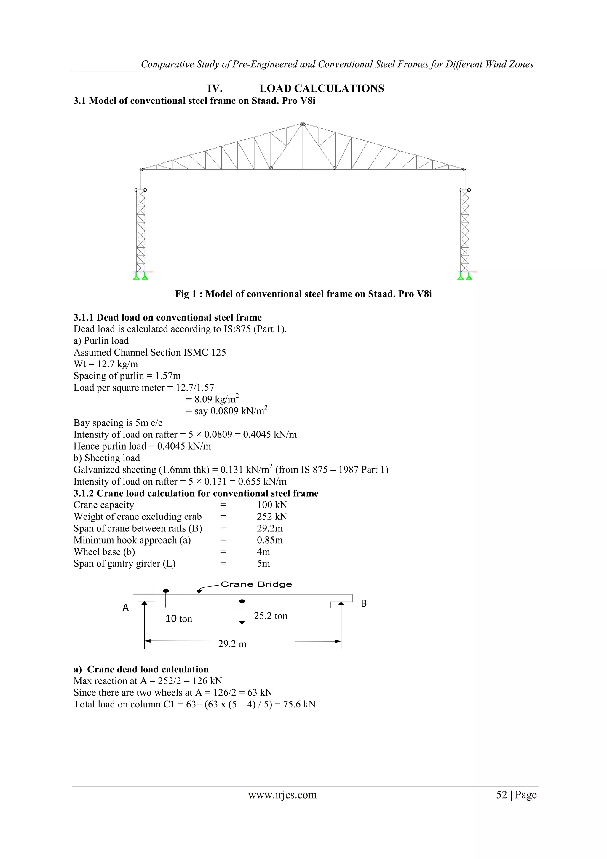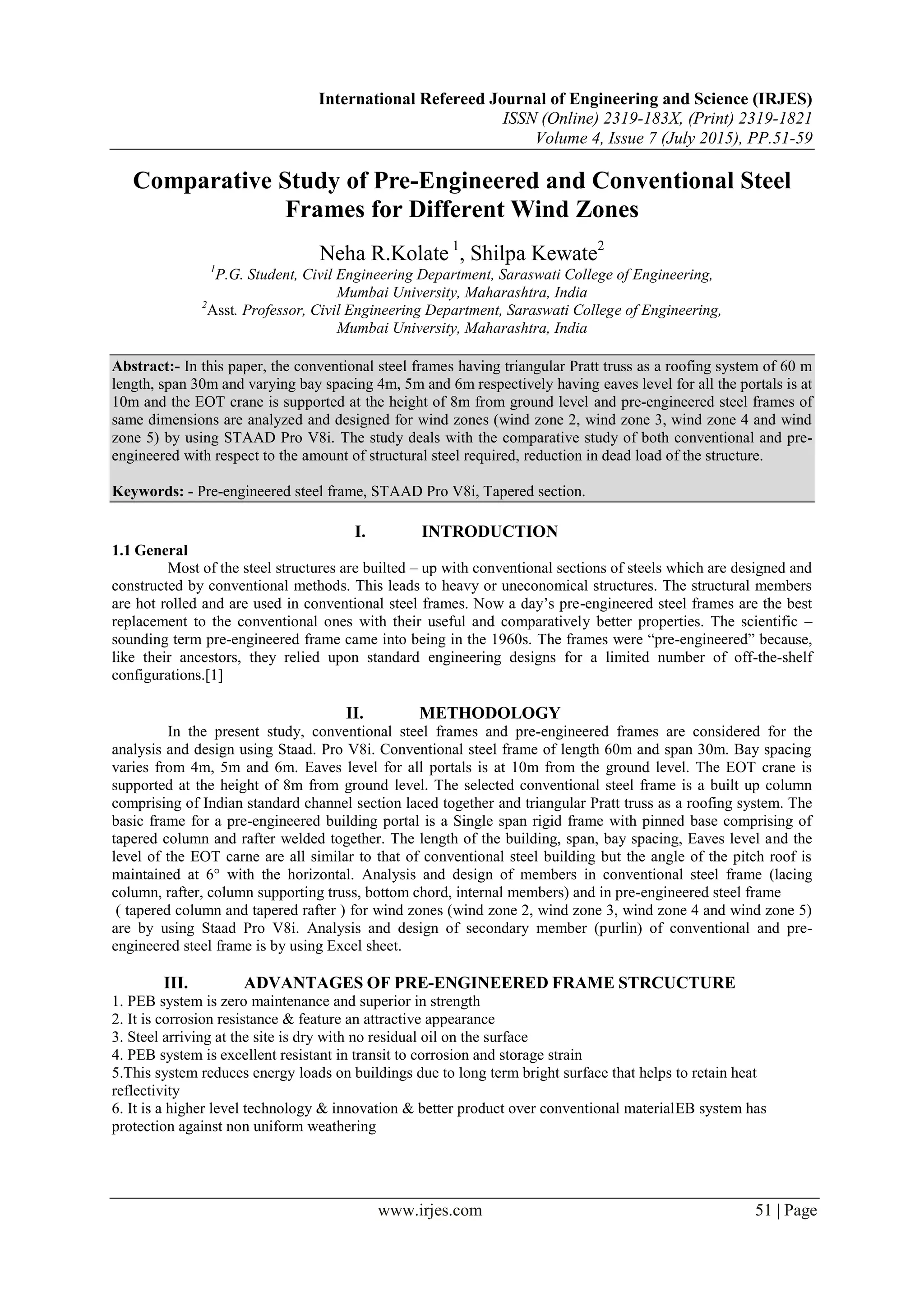 This document presents a comparative study of pre-engineered and conventional steel frames for varying wind zones, analyzing parameters such as structural steel usage and dead load reduction. Utilizing STAAD Pro V8i for design and analysis, the findings indicate that pre-engineered steel frames are more economical and efficient, with substantial reductions in both steel consumption and dead load compared to conventional frames. The study concludes that pre-engineered structures offer significant advantages for warehouse applications, including reduced costs and improved construction speed.