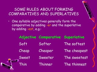This document provides rules for forming comparatives and superlatives in English. It explains that one-syllable adjectives typically take -er and -est, with spelling changes if the adjective ends in certain letters. Two-syllable adjectives ending in -y take -er and -est, while those ending in -ed, -ing, -ful or -less take more and most. Adjectives with three or more syllables also take more and most. Irregular adjectives like good, bad and far are also discussed. The uses of comparatives and superlatives are outlined, along with opposite forms less and least.