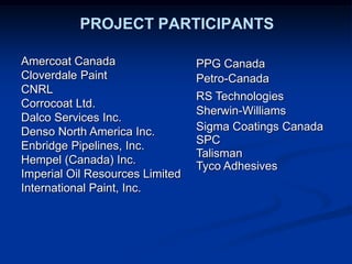 The document details comparative testing of 31 tank lining systems to evaluate their performance in various oil field environments, with the objective of aiding in the selection of appropriate coatings. Results include data on coating types and their respective performance metrics under specific conditions, such as adhesion, cathodic disbondment, and temperature resistance. The study encourages interaction between suppliers and end users to enhance coating selection processes.