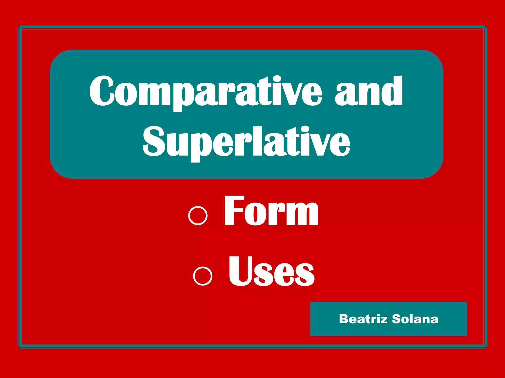 This document discusses the formation and use of comparative and superlative adjectives in English. It provides examples of how to make adjectives comparative using "-er" or "more" and superlative using "-est" or "most". It also covers irregular adjectives and using "than" in comparatives and "the" in superlatives. The document aims to review the key rules and forms of comparative and superlative adjectives.