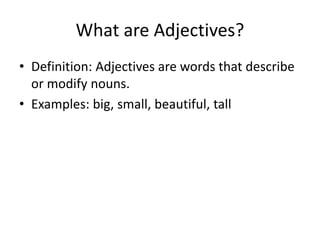 The document explains comparative and superlative adjectives, emphasizing their roles in modifying nouns and making comparisons. It details definitions, structures, and examples, including practice exercises and answers for learners. It concludes by summarizing the differences between comparative and superlative adjectives and encourages further practice.