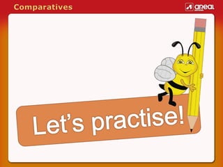 The document provides examples of using the phrases "as + adjective + as" and "more + adjective + than" to compare the qualities of different characters. It shows that "as + adjective + as" is used to indicate two things or people share the same level of a quality, while "more + adjective + than" suggests one thing or person has a greater level of a quality compared to the other. A variety of adjectives are given like tall, intelligent, beautiful, lazy, fatter, older, faster, uglier, courageous, and intelligent.