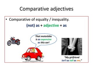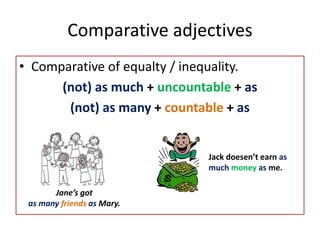 This document discusses how to form comparative adjectives and adverbs in English. It explains that comparatives of equality or inequality can be formed using "as...as" or "not as...as" structures. For adjectives, short forms add "-er" and long forms use "more/less". Adjectives ending in "-y" add "-ier". Irregular adjectives like "good" have comparative forms "better/worse". Comparative adverbs are formed by adding "as" or "more/less" before the base adverb.