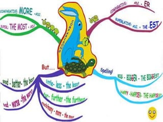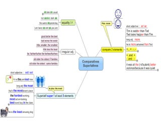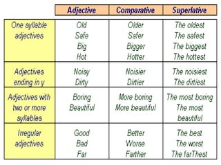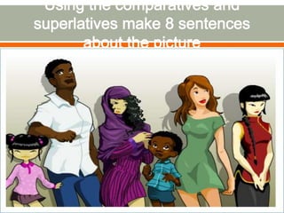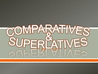 This document discusses comparatives and superlatives in English grammar. It explains that comparatives and superlatives are forms of adjectives used to compare two or more things. Comparatives are generally formed using -er and superlatives using -est. Students are instructed to work in pairs finding examples of comparatives and superlatives, the structures used to form them, and the difference between the two. They are provided links to online resources explaining comparatives and superlatives in both English and Spanish. The goal is for students to be able to express their own ideas using these forms at the end of the lesson.