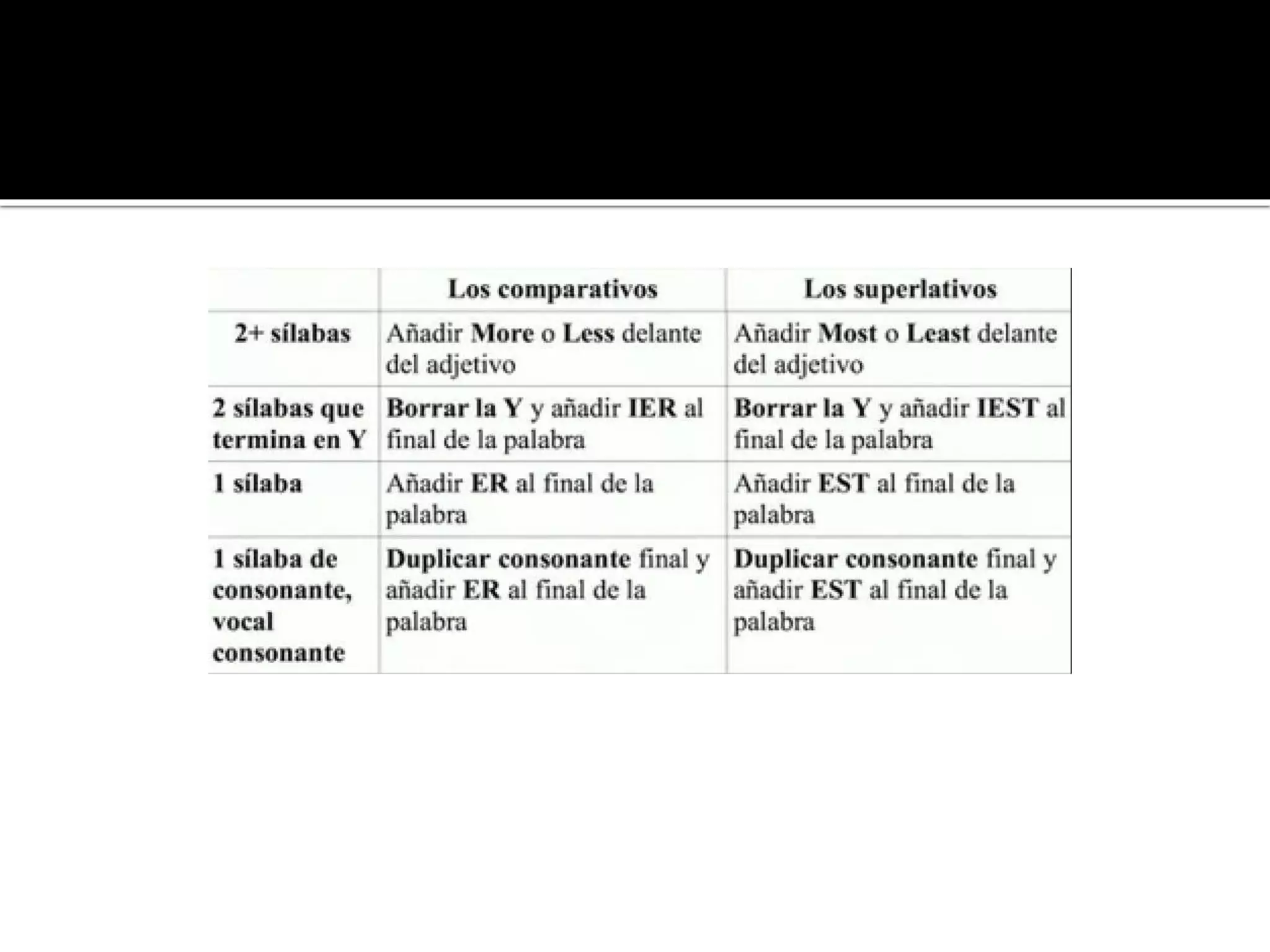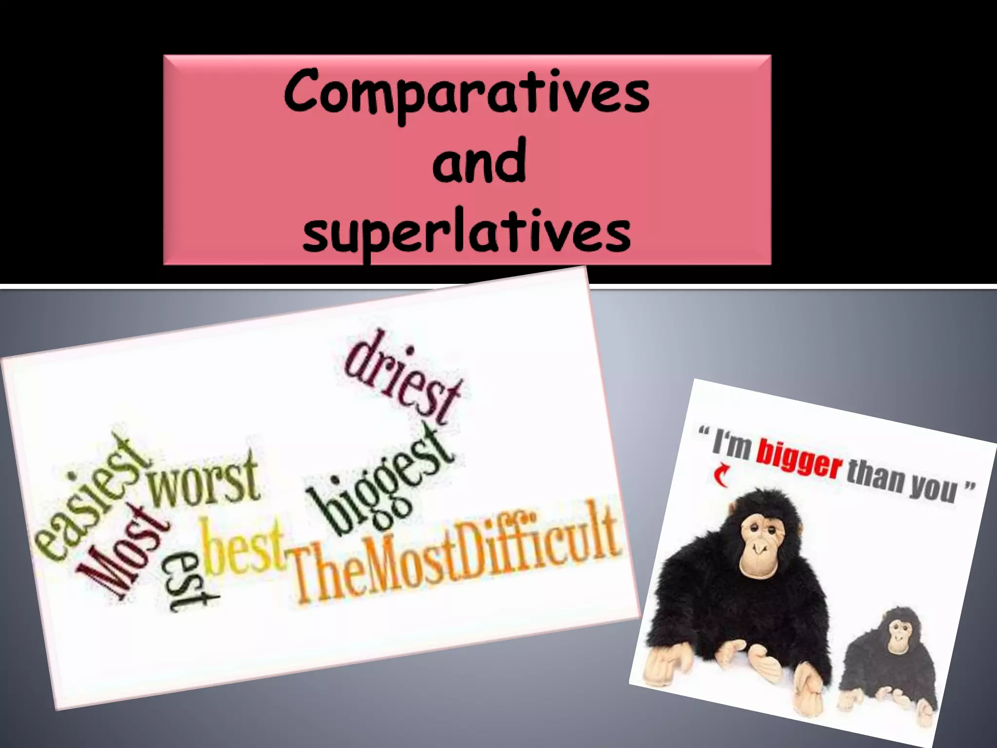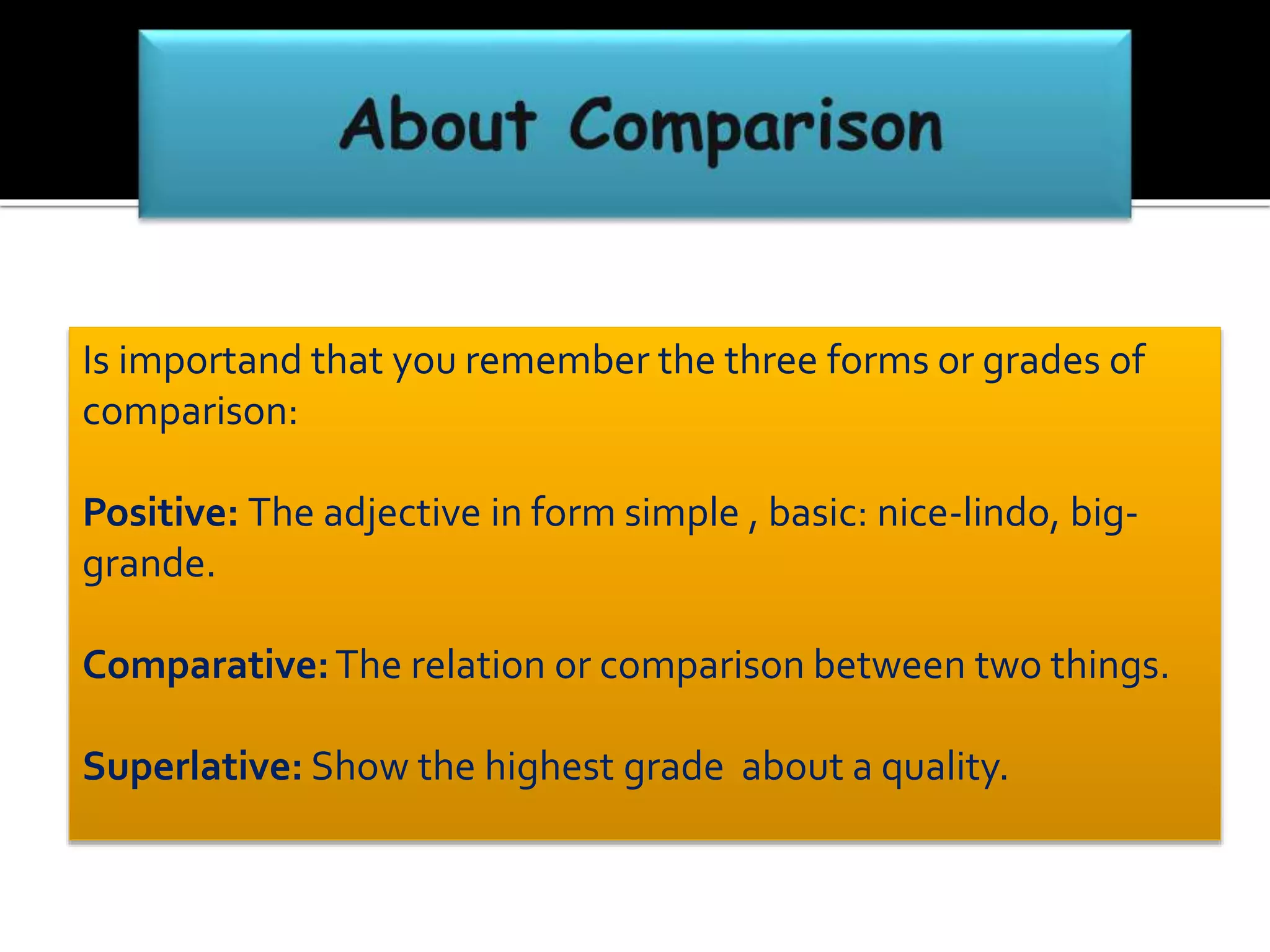 This document provides an overview of comparative and superlative forms in English. It discusses the positive, comparative, and superlative forms of adjectives and how they indicate equality, superiority, or inferiority in comparisons. It outlines the various structures used to form comparatives and superlatives, including "er/est" endings for short adjectives and "more/most" and "less/least" for all adjectives. It also notes exceptions and irregular forms for some common adjectives like "good", "bad", "many", and adjectives of two or more syllables. Examples are provided throughout to illustrate the different structures.