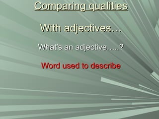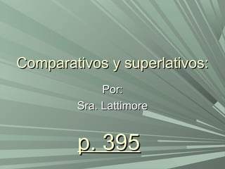 This document discusses comparatives and superlatives in Spanish. It provides examples of using adjectives, nouns, verbs and irregular terms to compare qualities, quantities, and other attributes. For adjectives, the suffixes "-er" and "-est" become "-or" and "-or" in Spanish (e.g. older = mayor que, better = mejor que). Examples are given such as "My husband is taller than my cousin" and "I like hamburgers more than tacos."